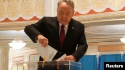 Отходивший в этот момент от урны Назарбаев остановился на пару секунд, развернулся в сторону корреспондентов, улыбнулся, немного расставил руки и пошел обратно.